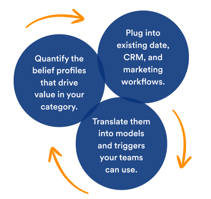 We pinpoint the belief profiles that drive choice in your category, quantify their value within your customer base, and translate them into actionable intelligence. Then we embed those insights inside your existing systems, as prioritization rules, activation triggers, and journey logic, so you can shape behavior, not just measure it.